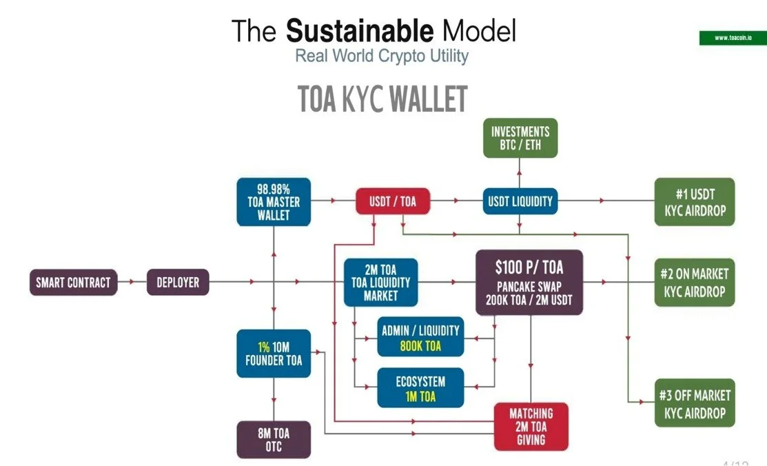 In our innovative approach to sustainable giving, the giving wallet operates on a unique model designed to maximize impact over time. Before any distribution occurs, the wallet must accumulate a total of 200,000 TOA tokens. To achieve this, 100,000 TOA tokens will be acquired through on-market purchases on PancakeSwap. In addition the founders will match this amount, ensuring a robust foundation for sustained philanthropic efforts. Only once this threshold is reached will the wallet begin utilizing 2.5% annually of all generated funds for philanthropy, thereby ensuring a steady and impactful flow of support to deserving causes.